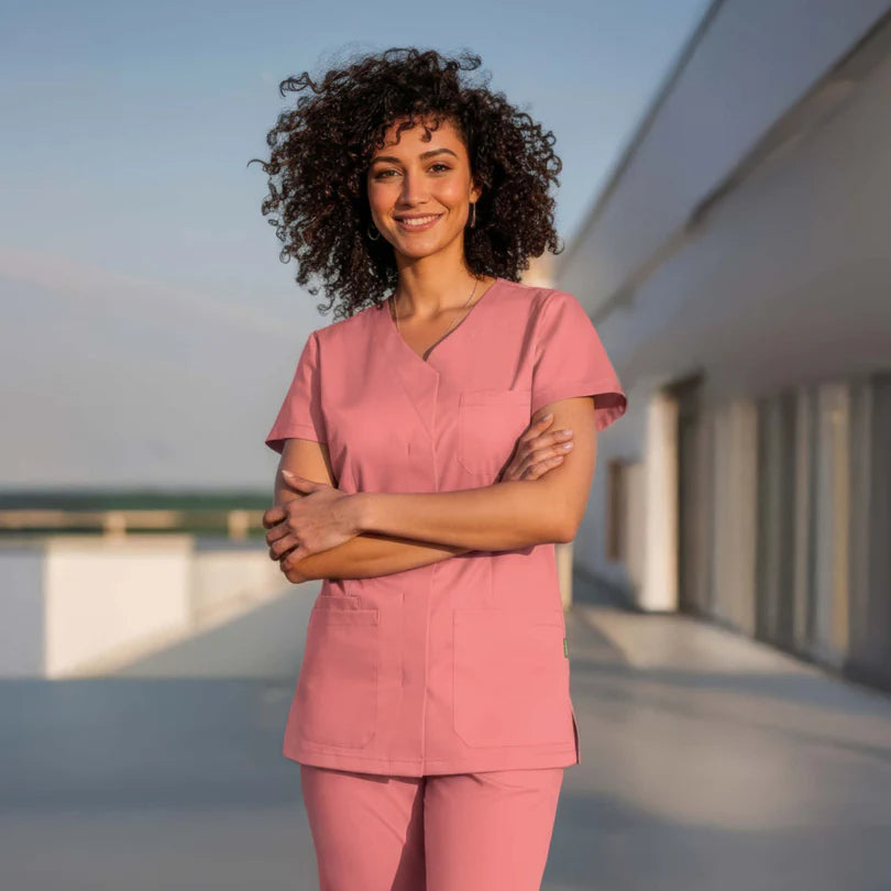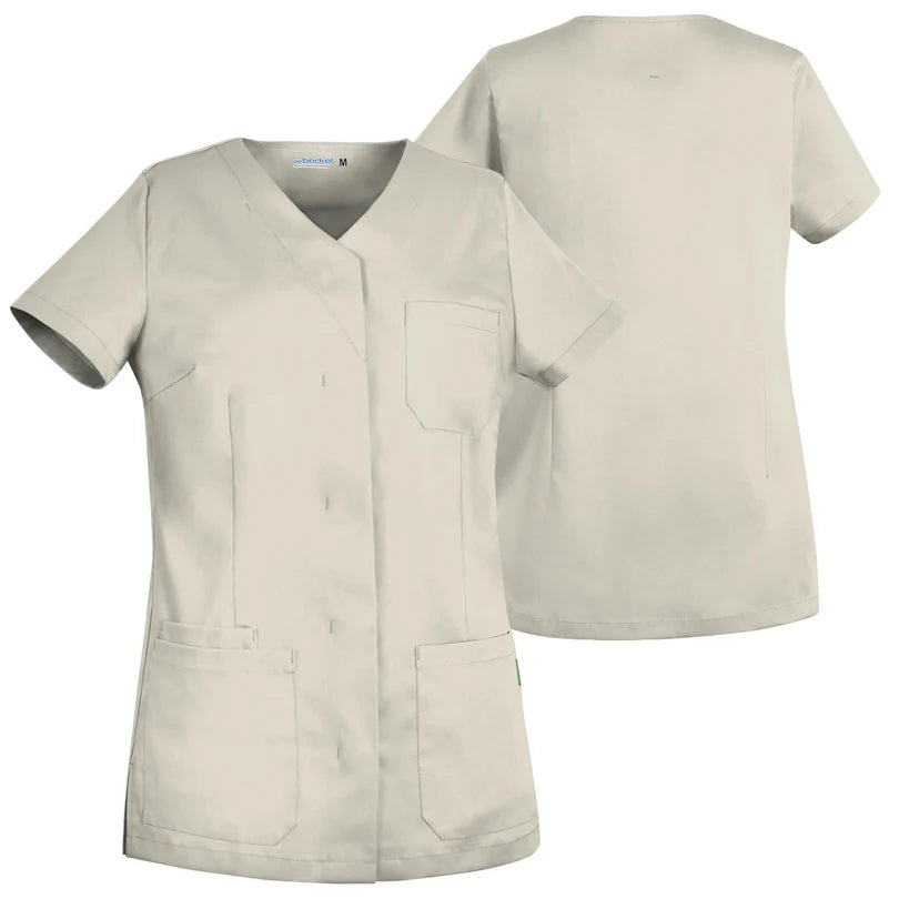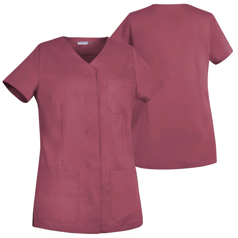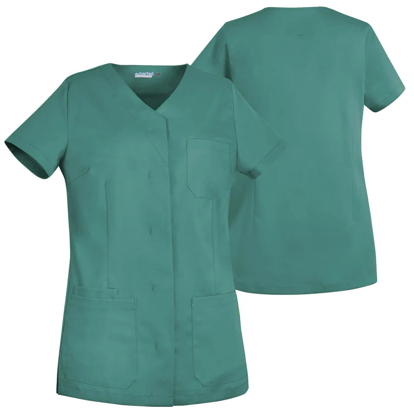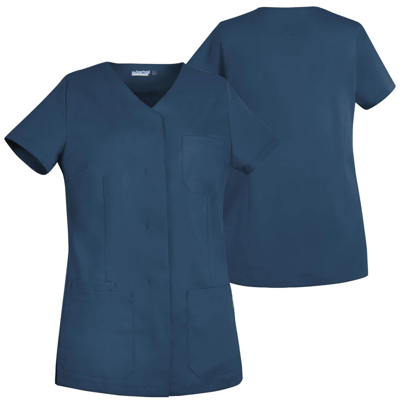 De vrouwelijke pasvorm in combinatie met de verdekte drukknoopsluiting en V-hals zorgt voor een moderne, professionele uitstraling. Praktische zakken en zijsplitten maken deze kasack ideaal voor intensief gebruik in ziekenhuizen, klinieken en andere zorgomgevingen.
